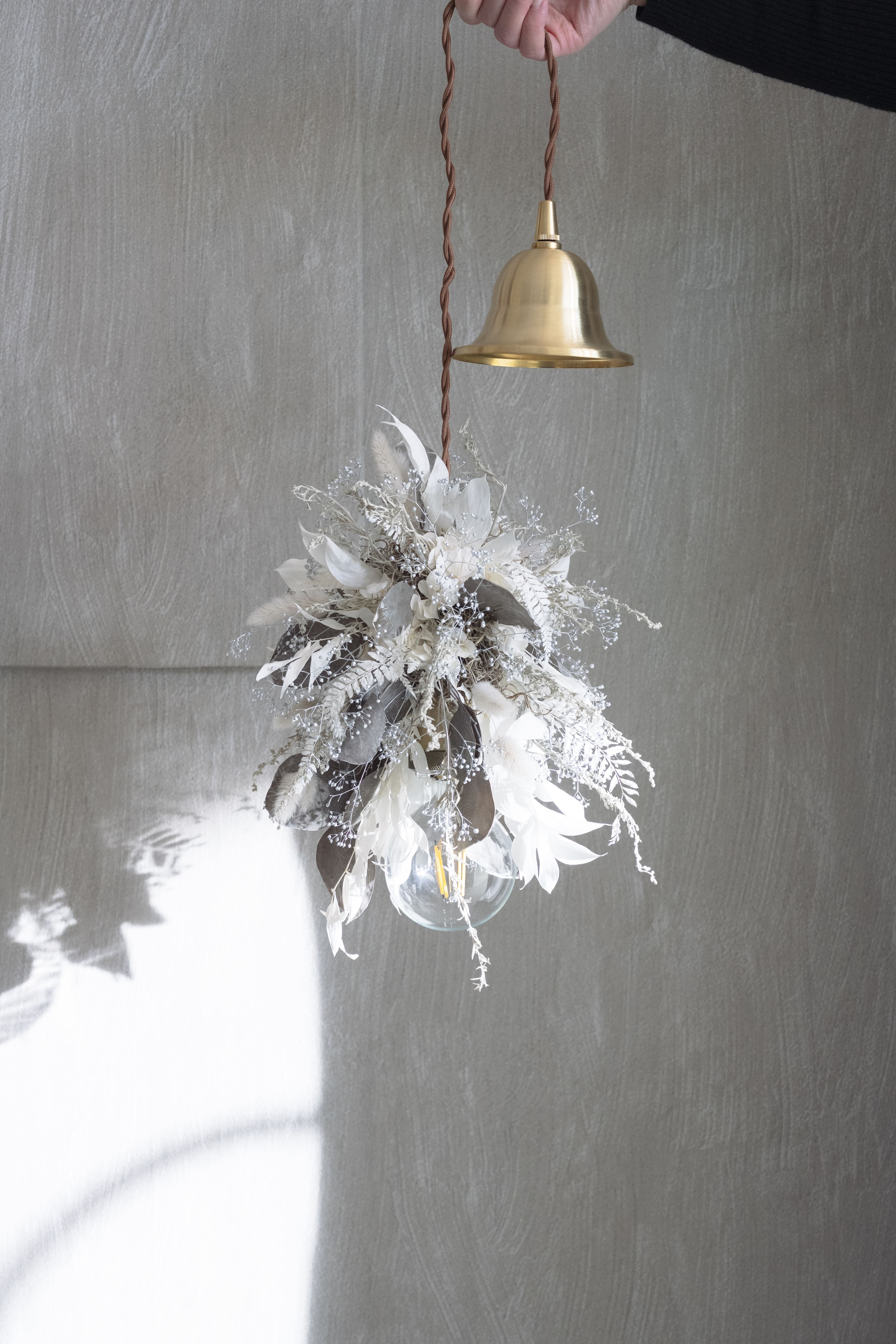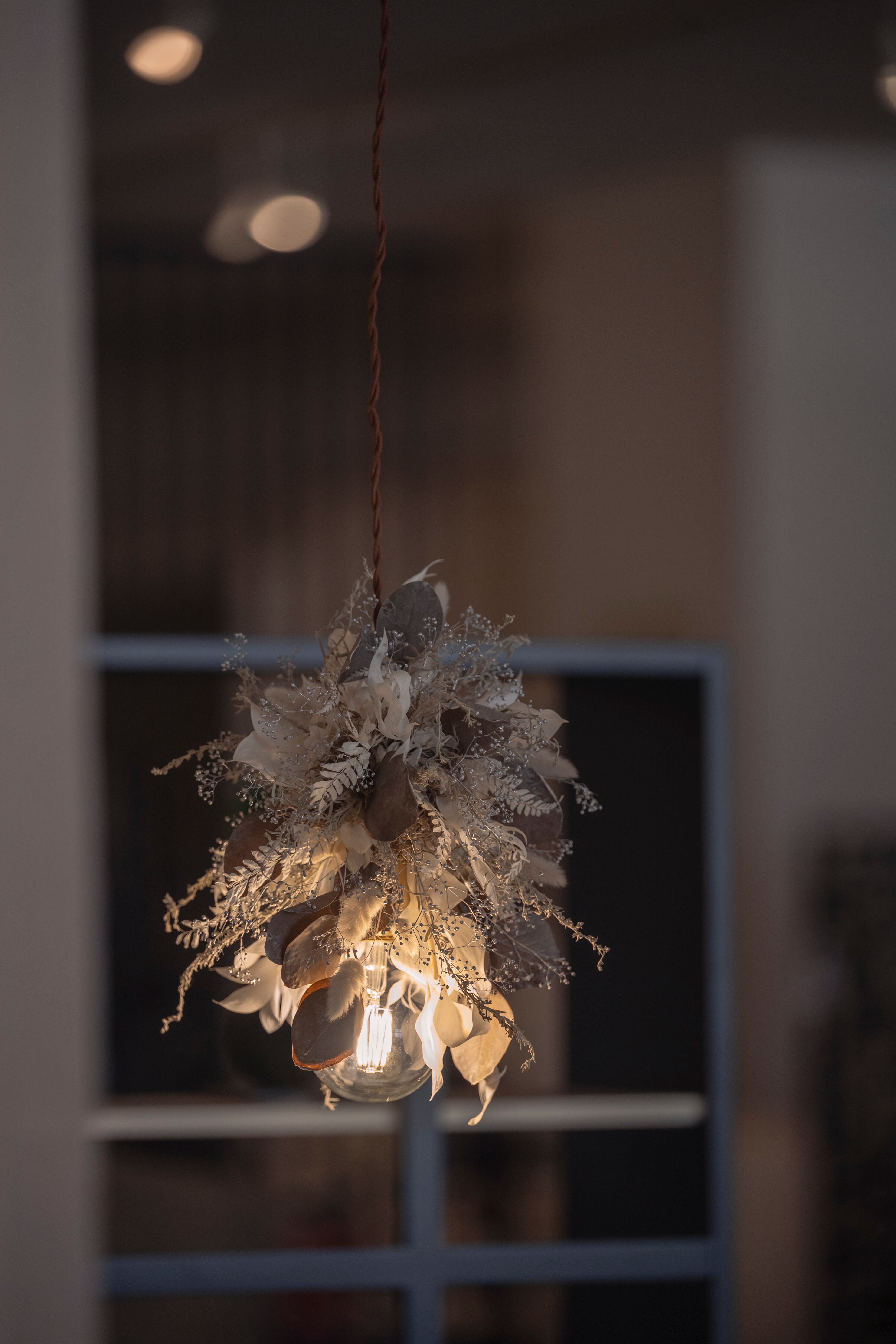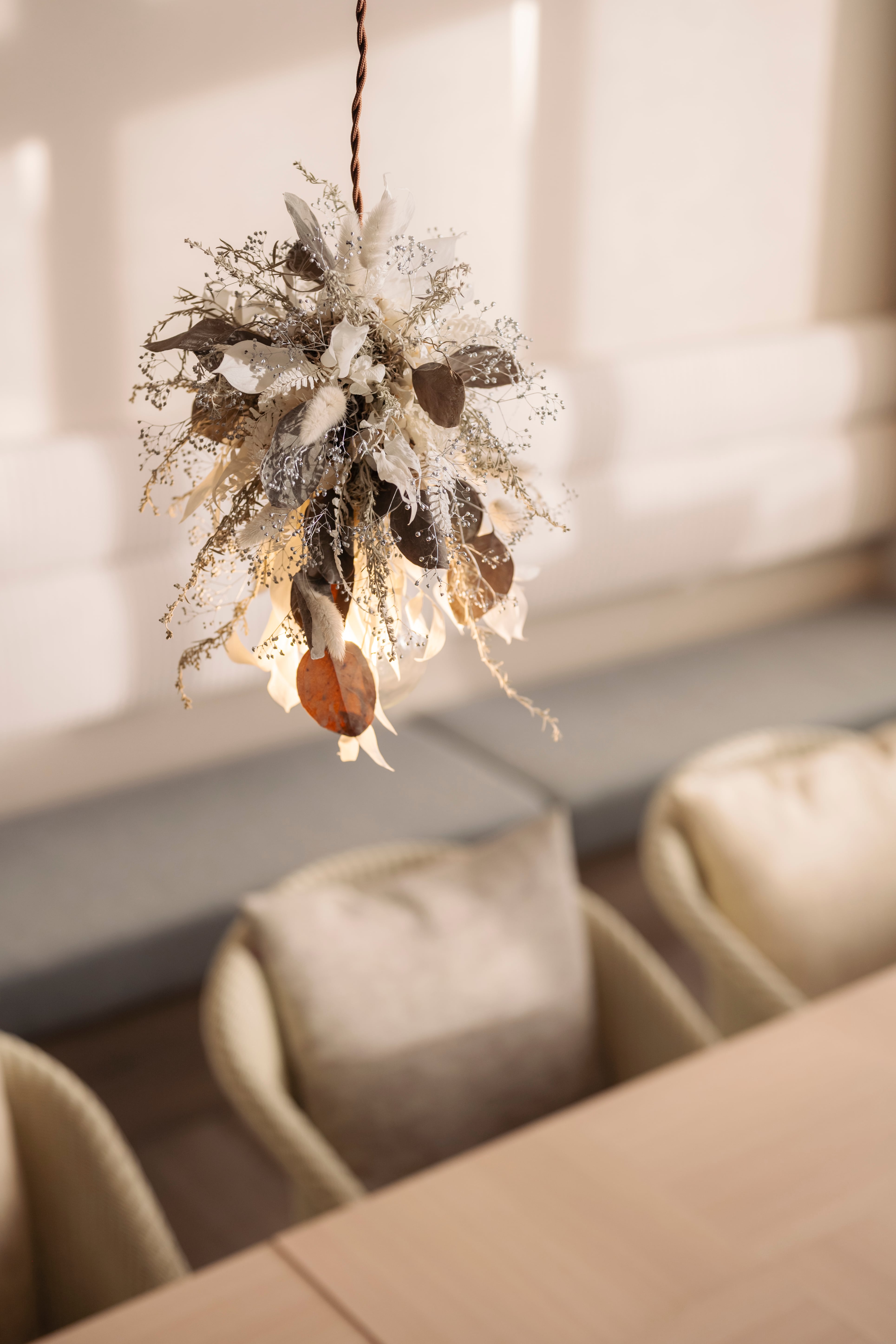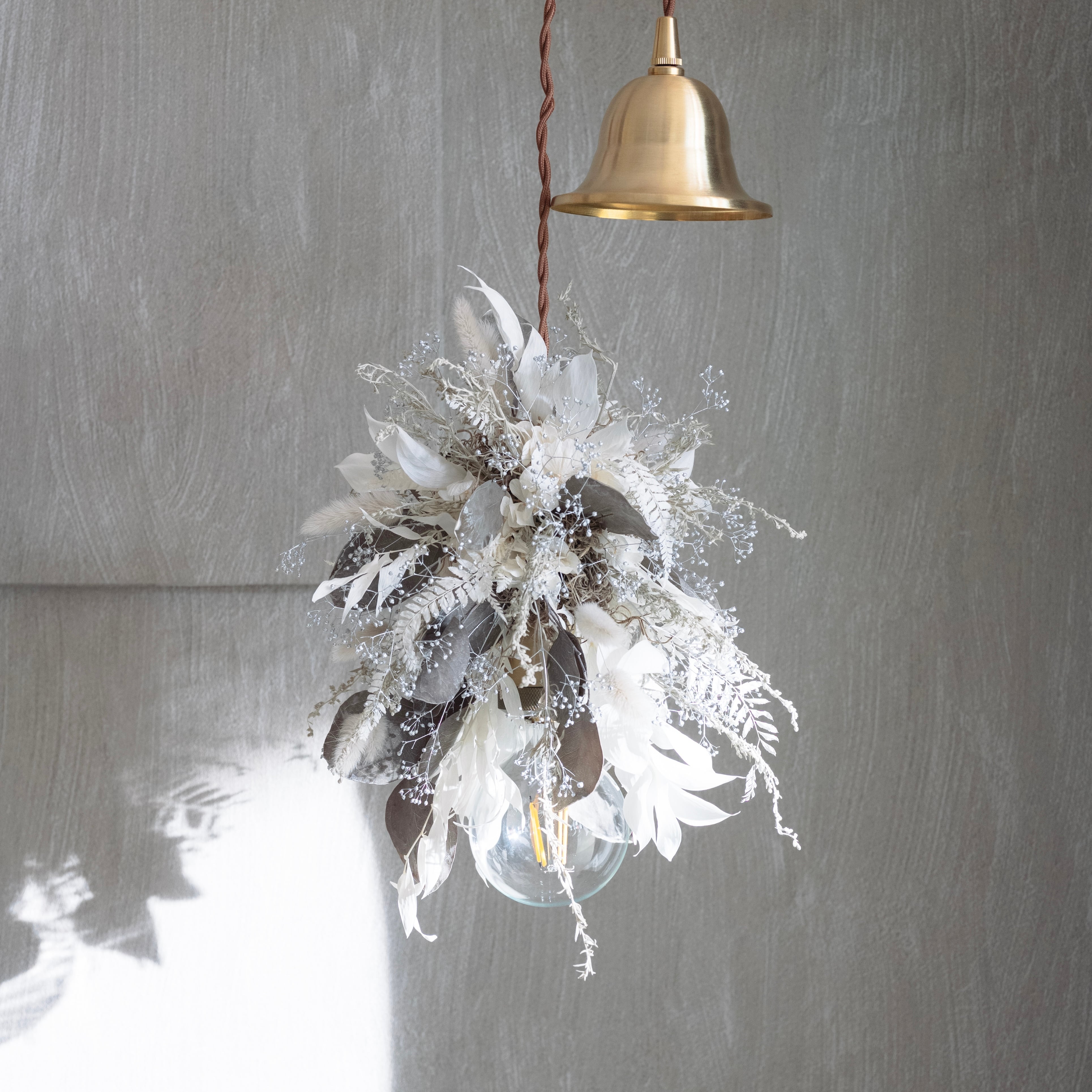 ホワイト・シルバー・グレーのニュアンスカラーでまとめた、洗練されたフラワーシャンデリア。小ぶりなデザインのため、空間においても主張しすぎることなく、さりげなく上質なアクセントとして馴染みます。硬質な花材の中に、柔らかな質感のラグラスを織り交ぜることで、儚さとやさしさを感じさせる表情に仕上げました。