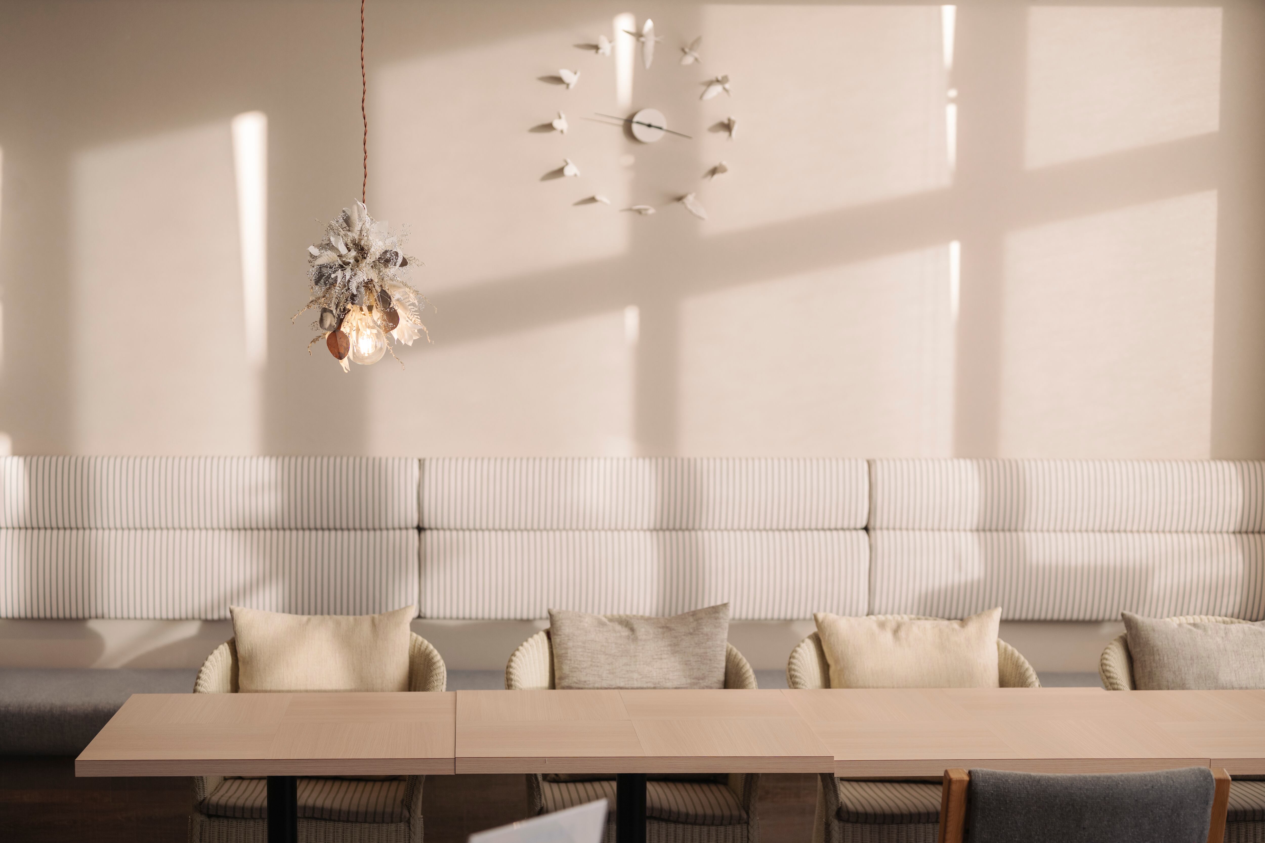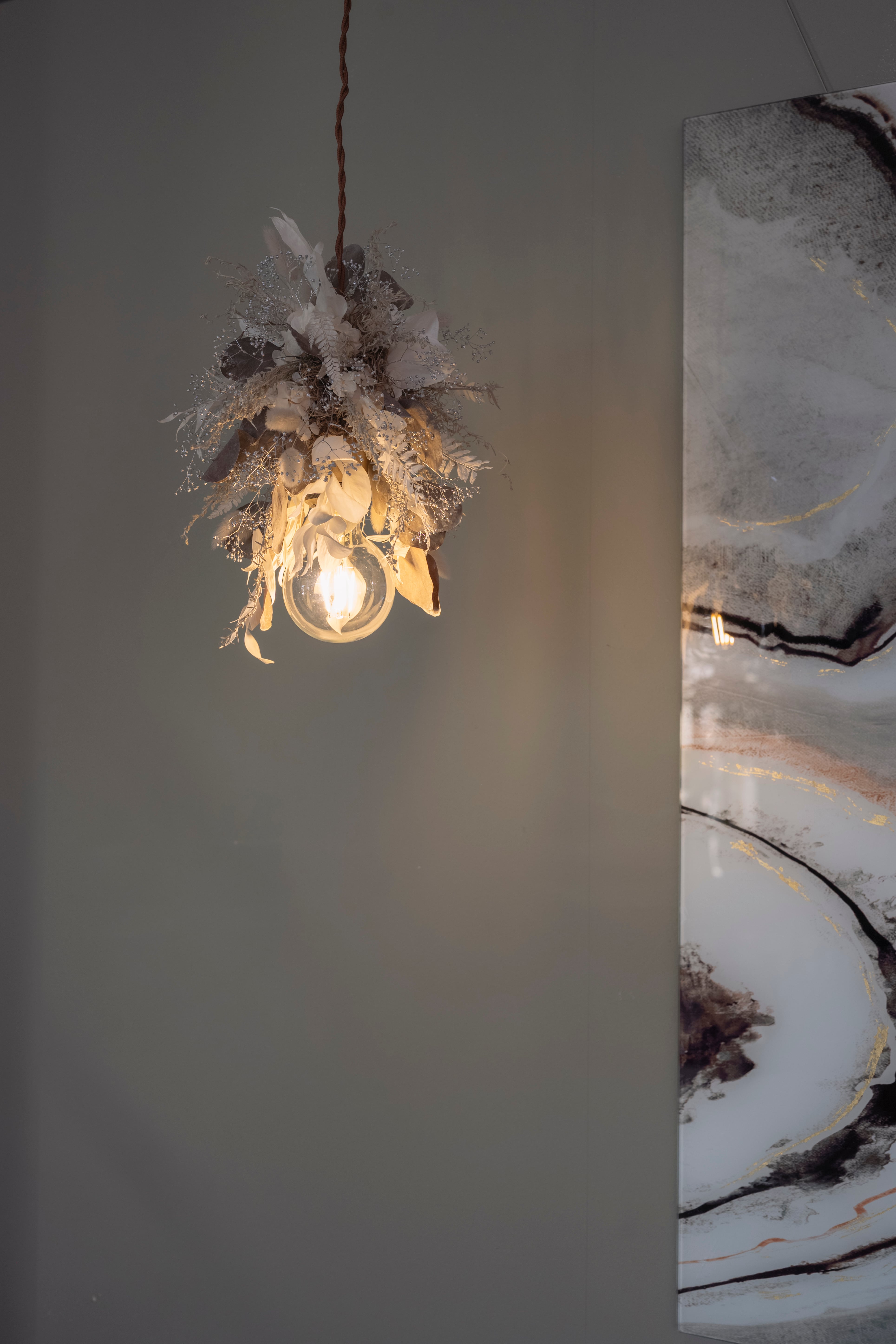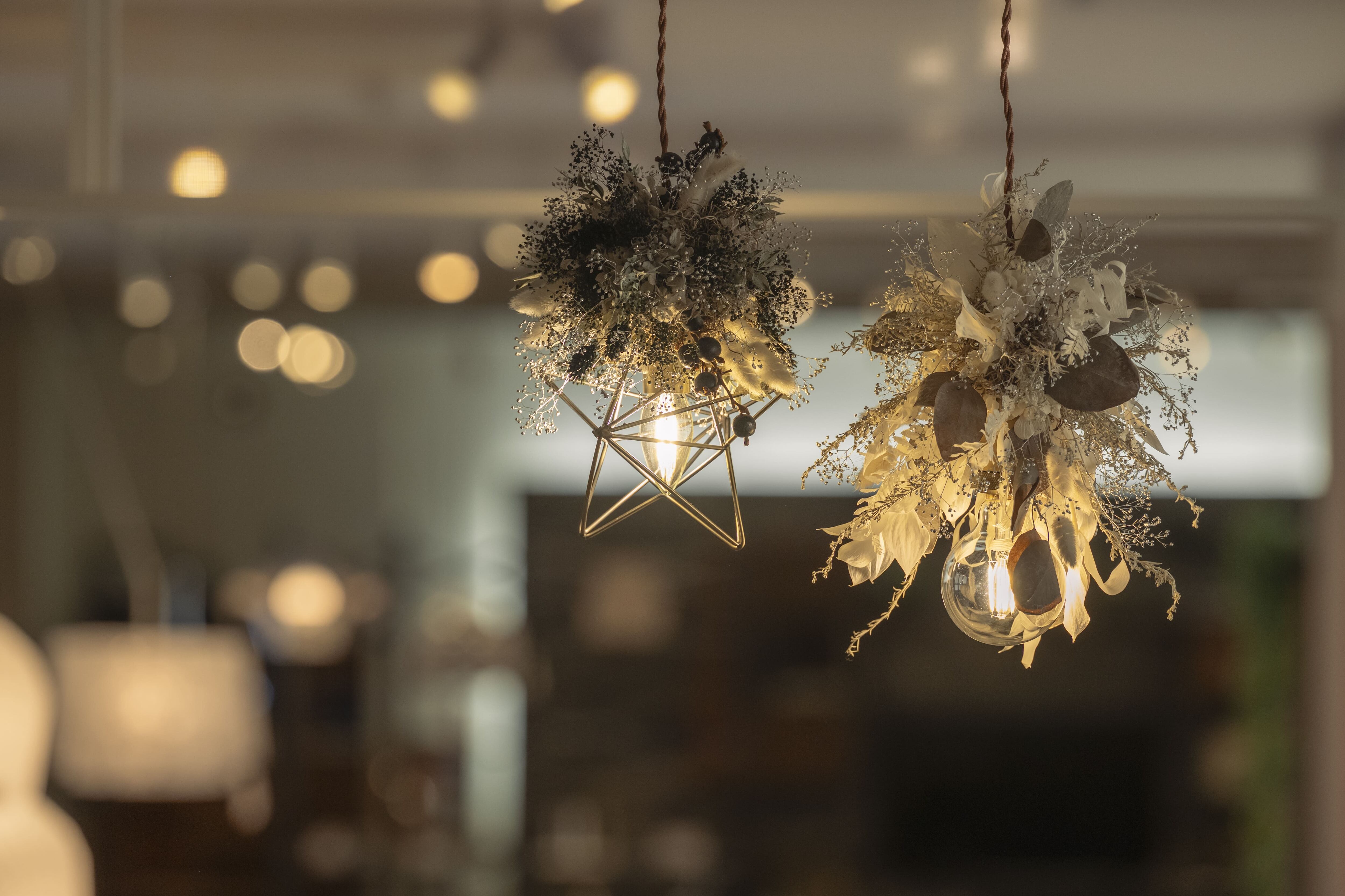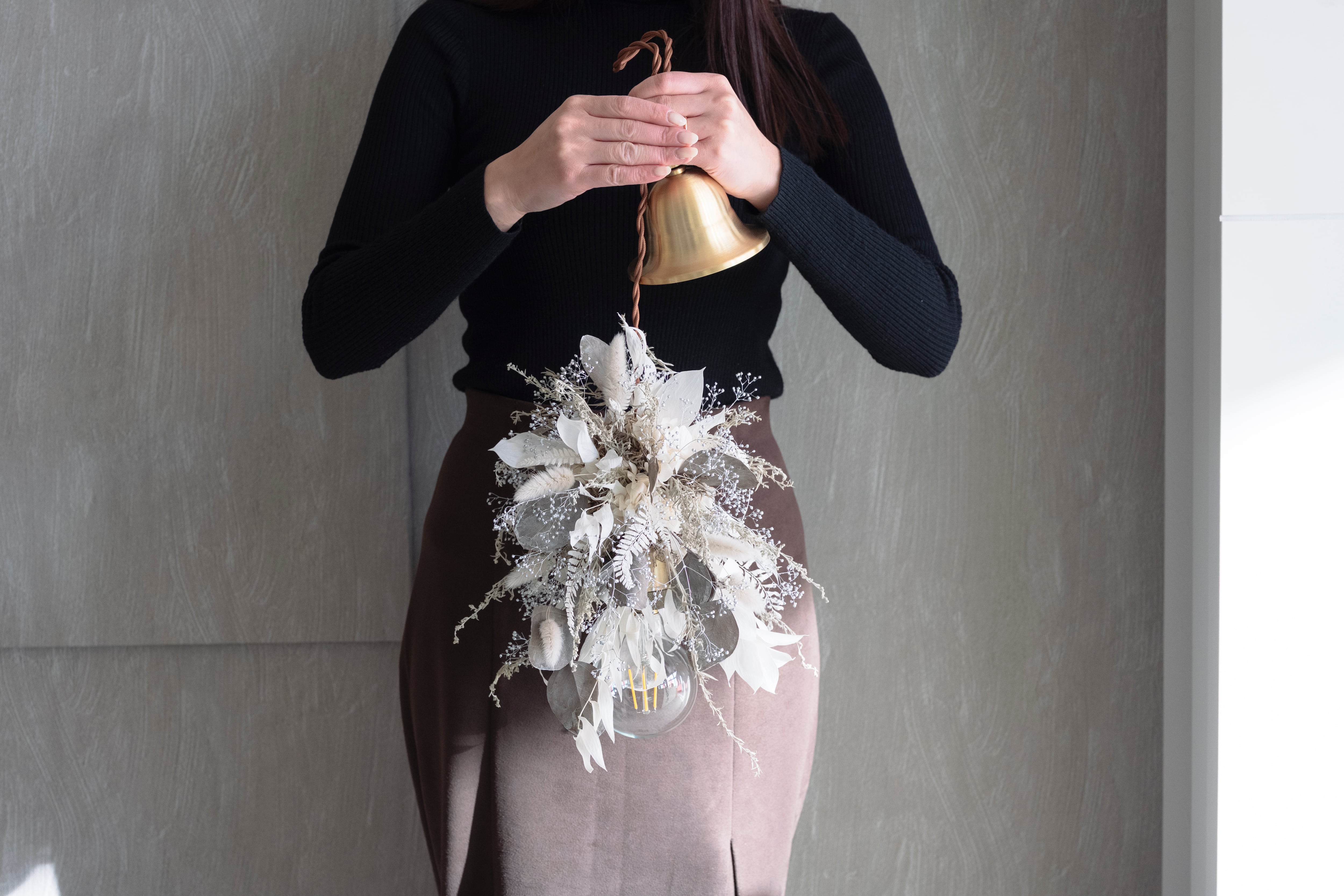 ホワイト・シルバー・グレーのニュアンスカラーでまとめた、洗練されたフラワーシャンデリア。小ぶりなデザインのため、空間においても主張しすぎることなく、さりげなく上質なアクセントとして馴染みます。硬質な花材の中に、柔らかな質感のラグラスを織り交ぜることで、儚さとやさしさを感じさせる表情に仕上げました。