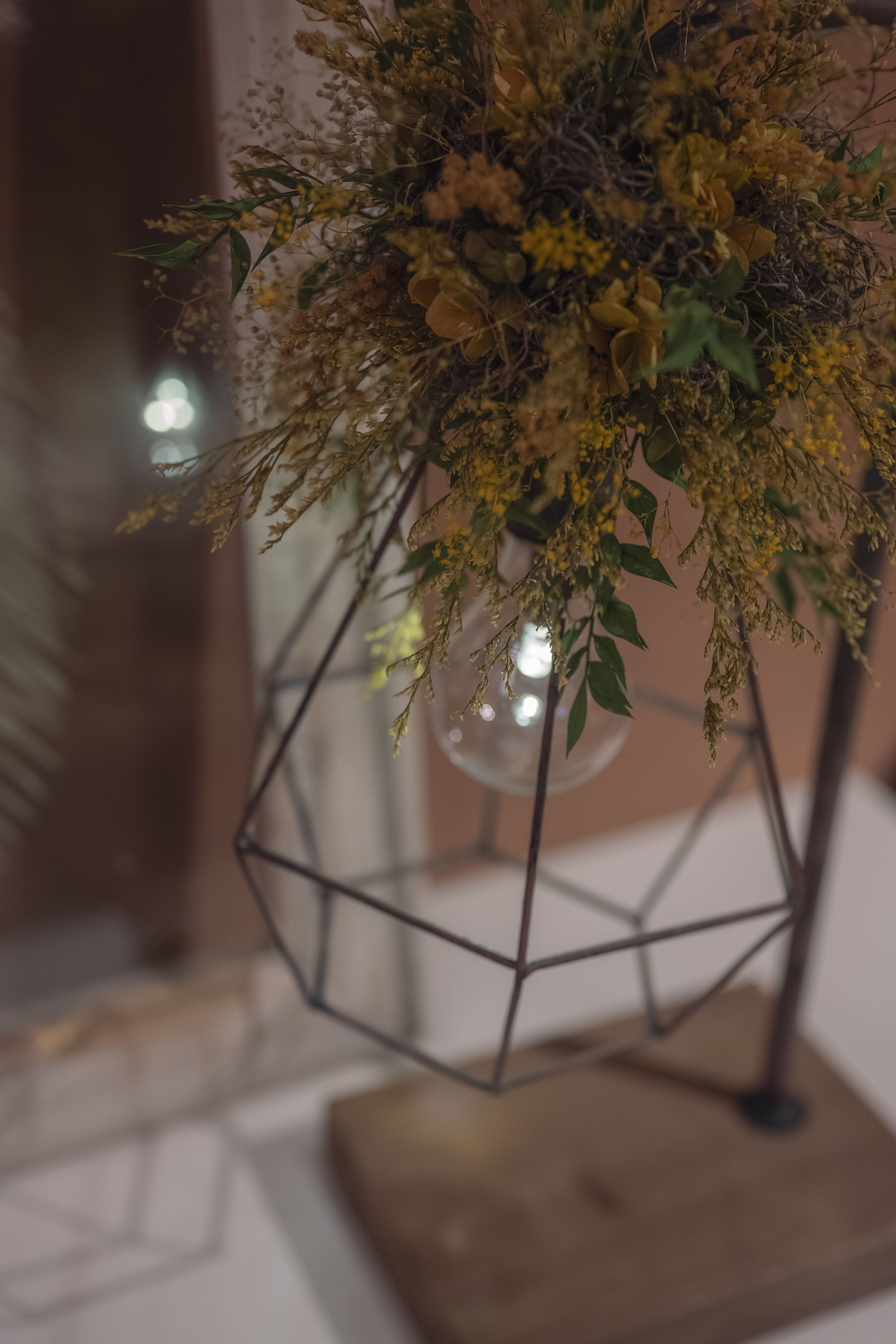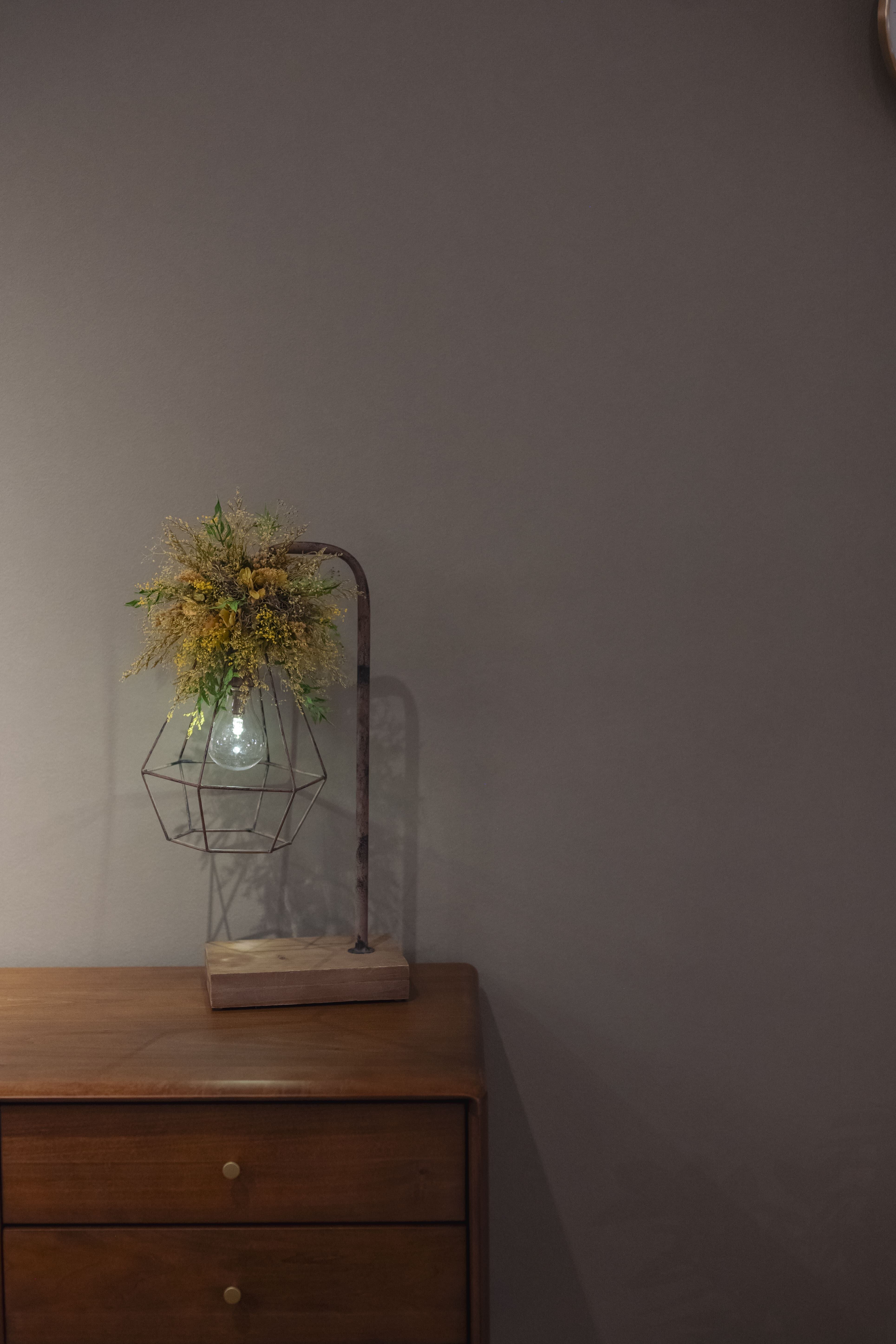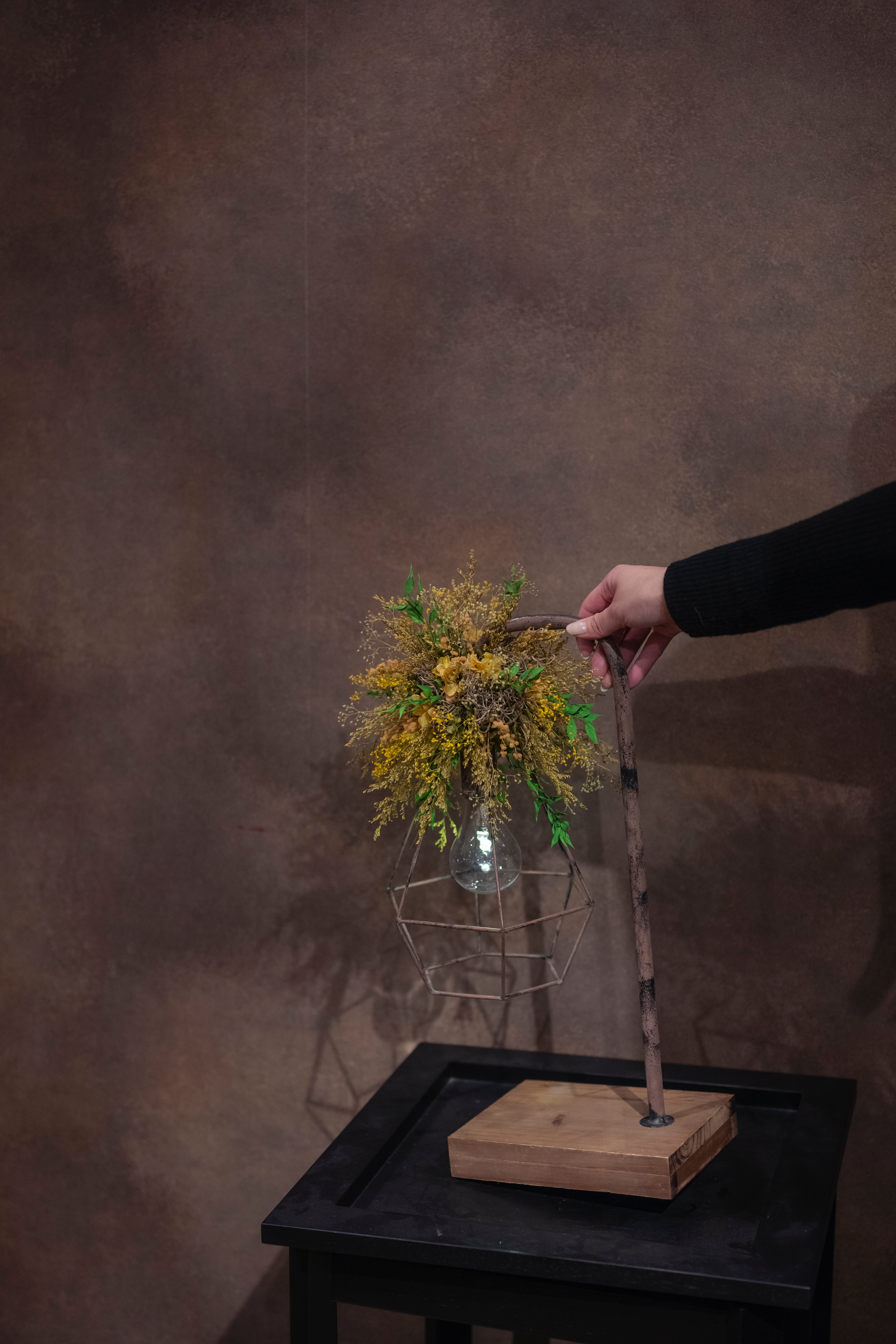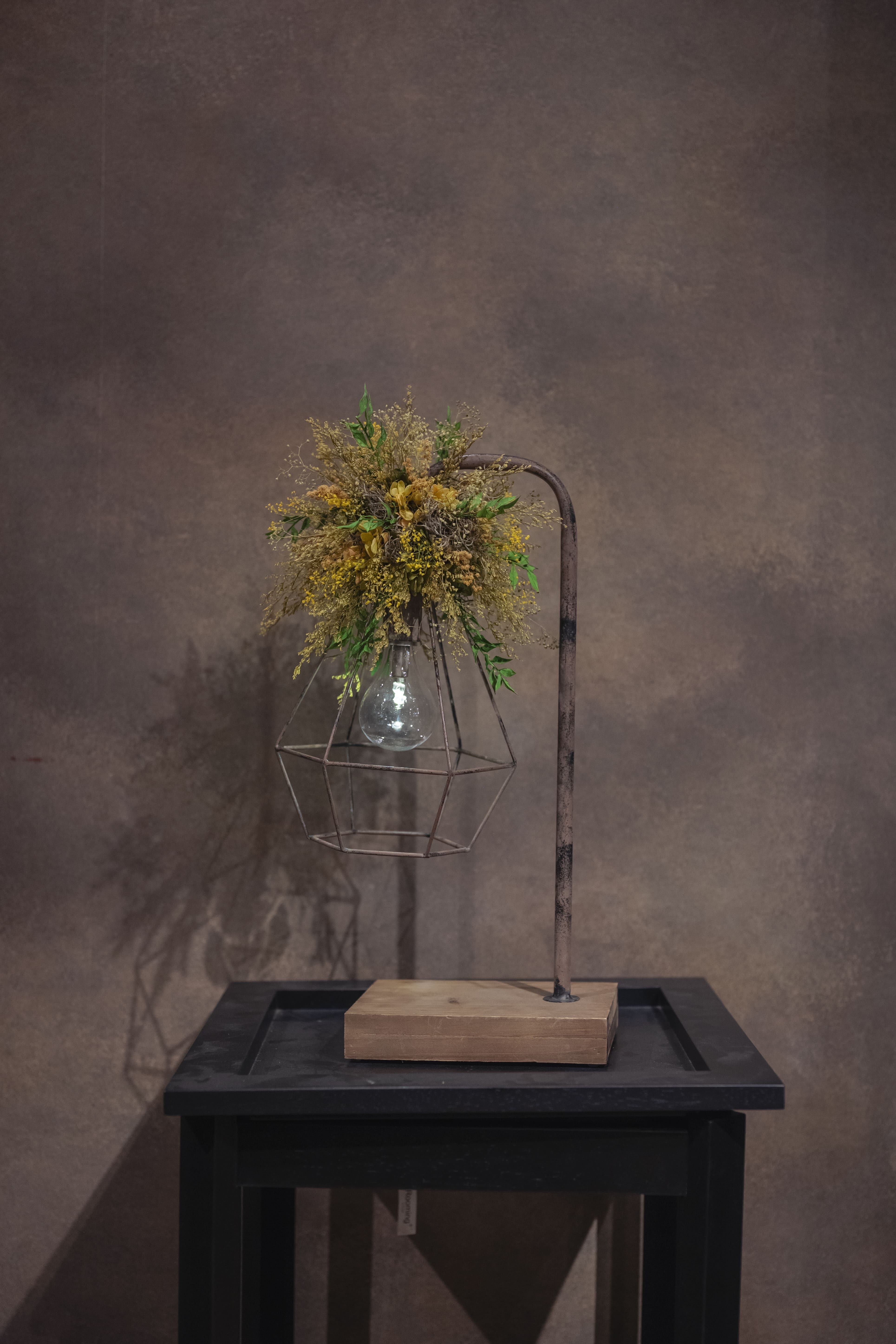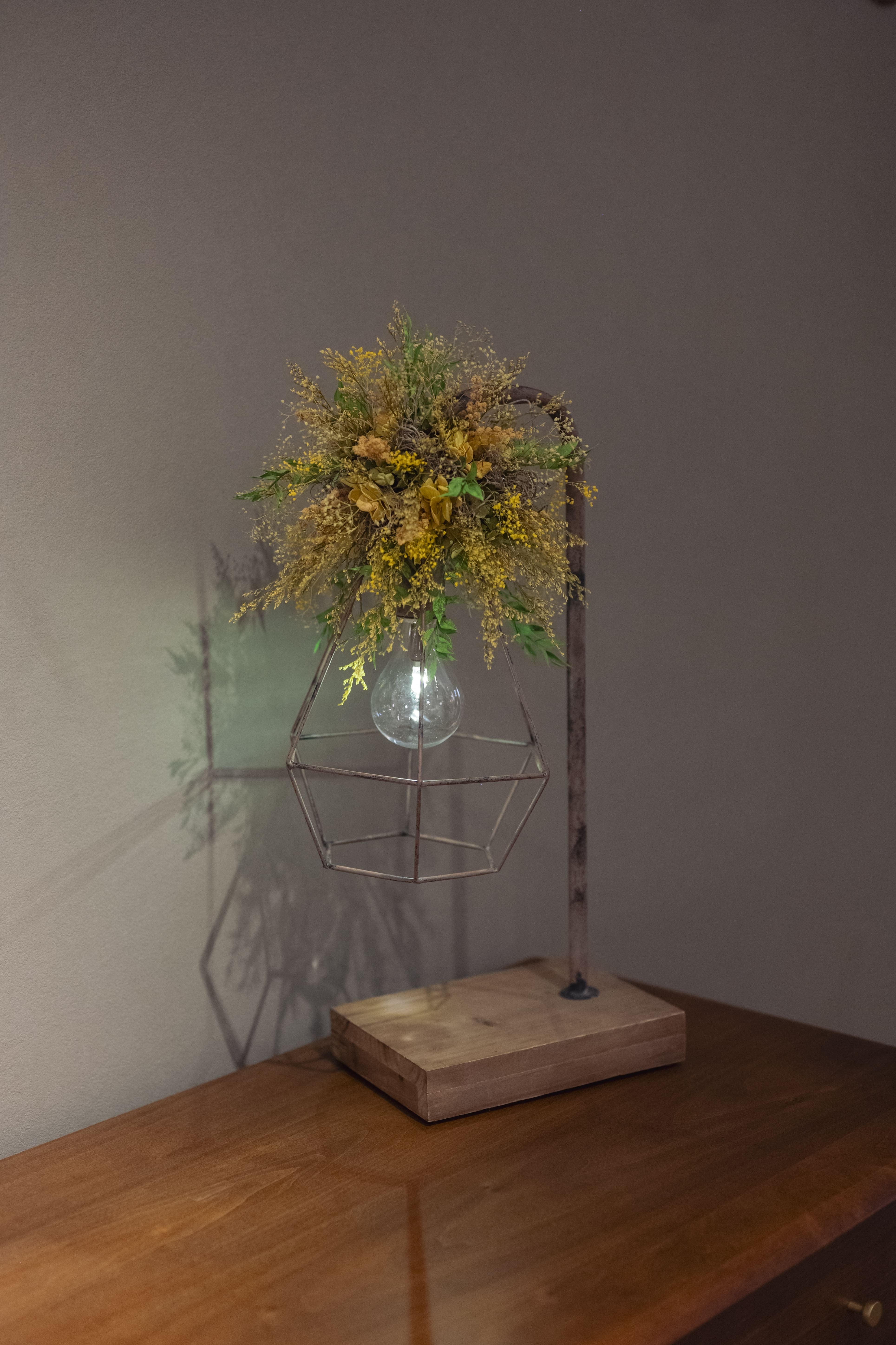 アンティークブラウンの機材とイエローグリーンの組み合わせが大人気。ミモザが可愛らしいアクセントとなり、ナチュラルでやさしい印象に仕上げました。電池式のためコンセント不要で置く場所を選びません。ローテーブルや棚の上に飾ることで、空間にさりげない彩りをプラスします。