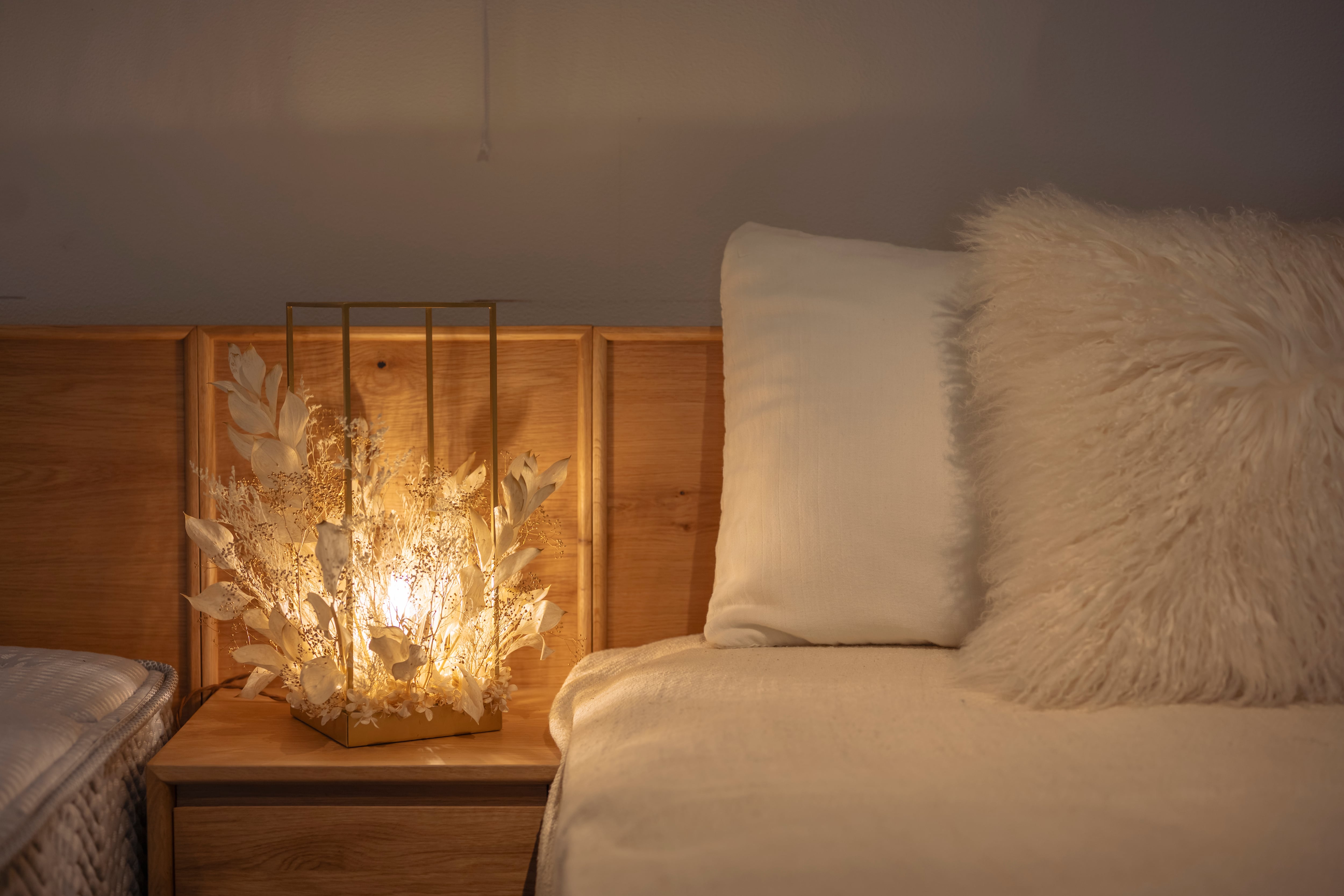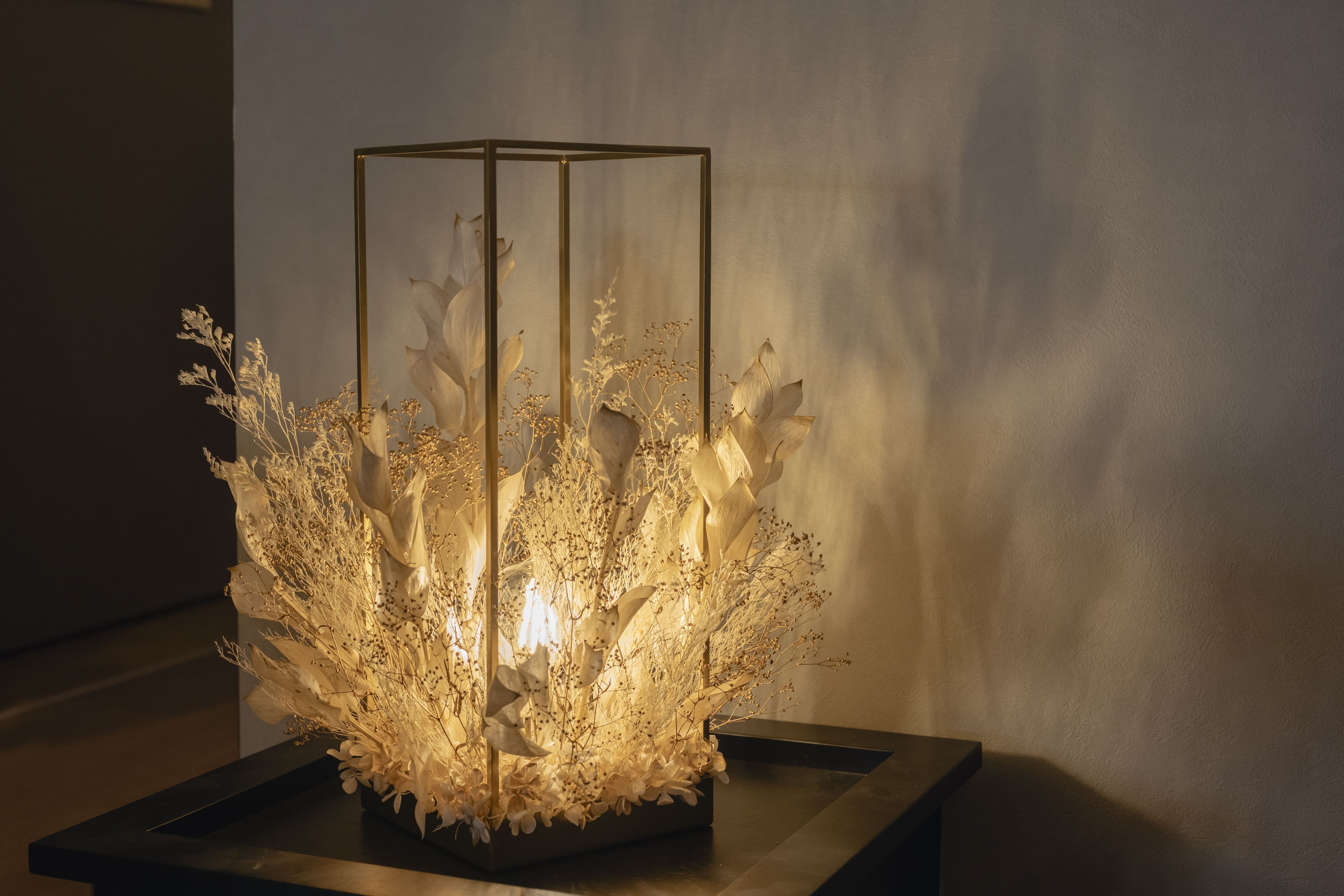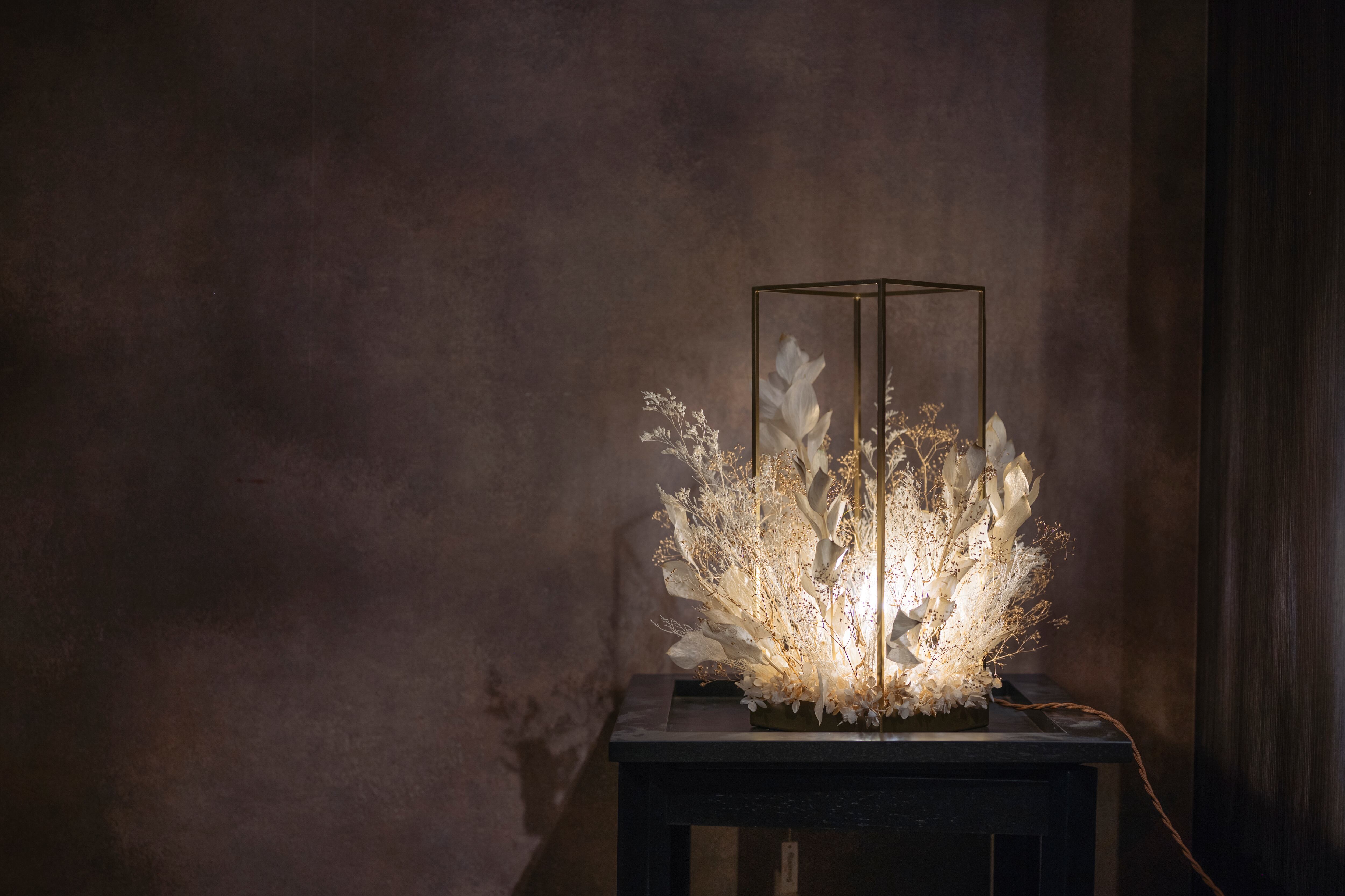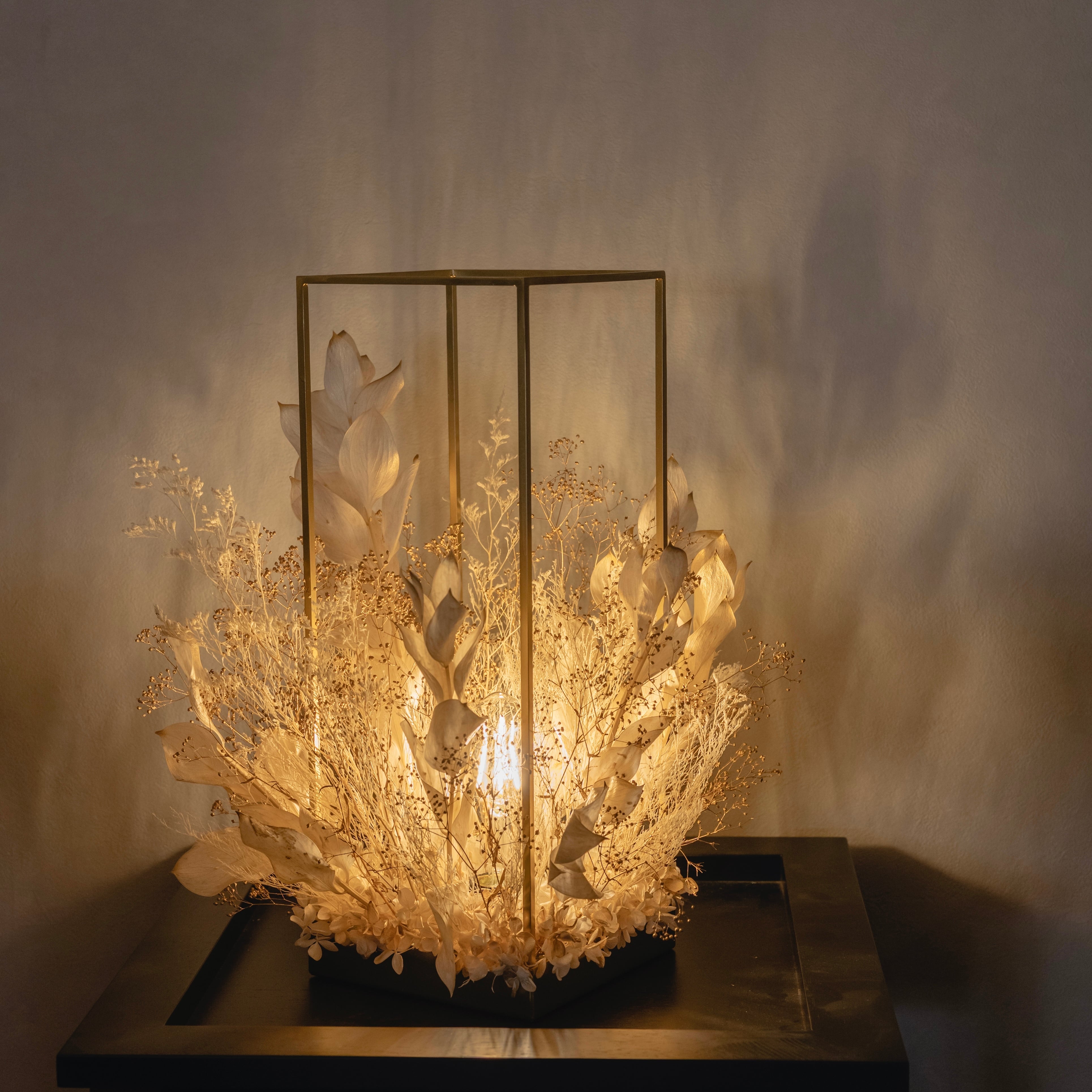 ゴールド調のフレームに、ホワイトゴールドの花材を贅沢にアレンジ。上質な輝きが空間に広がる、高級感あふれるフラワーシャンデリア。花材の隙間からこぼれる光と影が、床や壁に幻想的な表情を描き、癒しの空間が完成します。調光機能付きで、シーンや気分に合わせて明るさの調整も自由自在。日常をワンランク上の時間へと導く、特別な照明です。