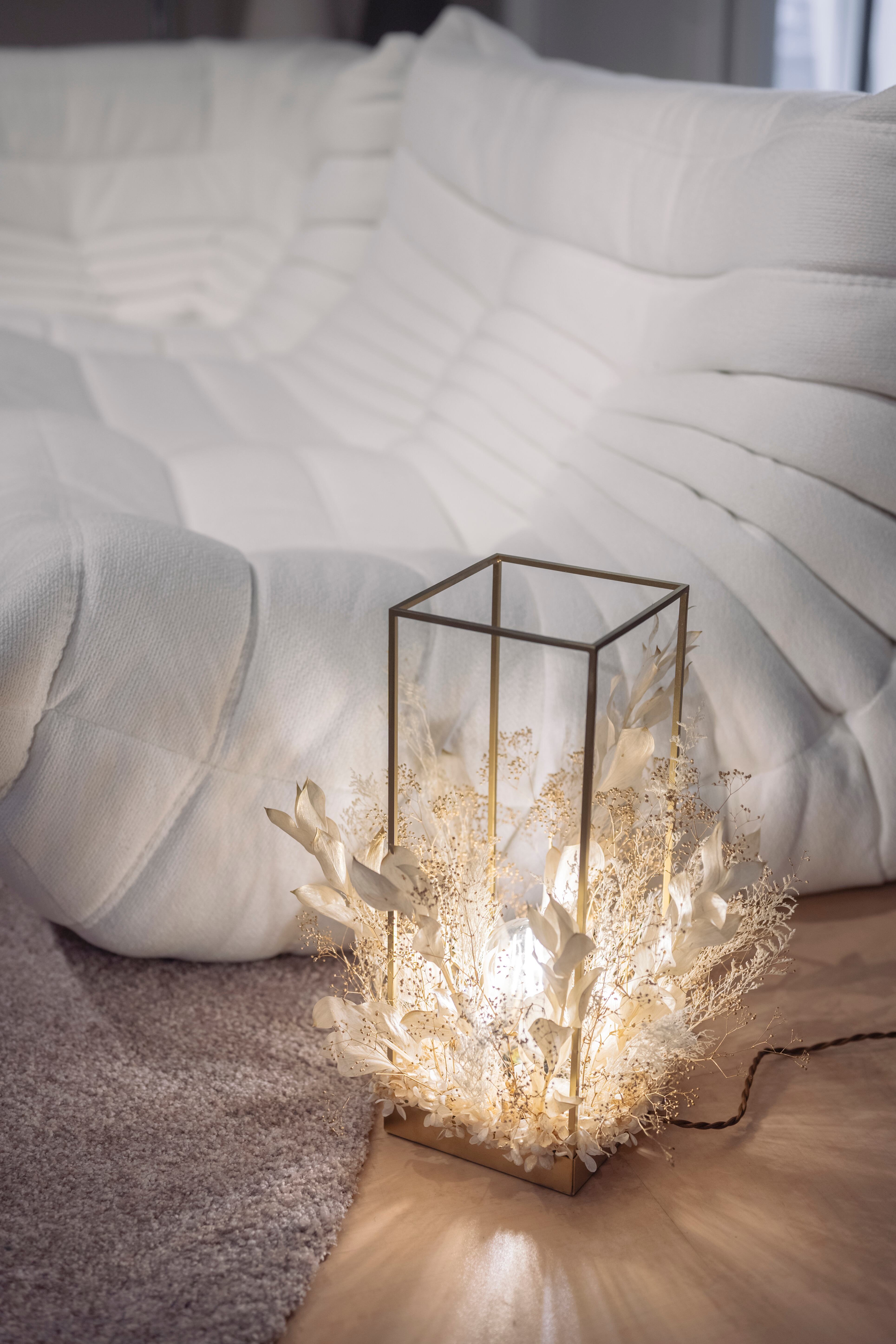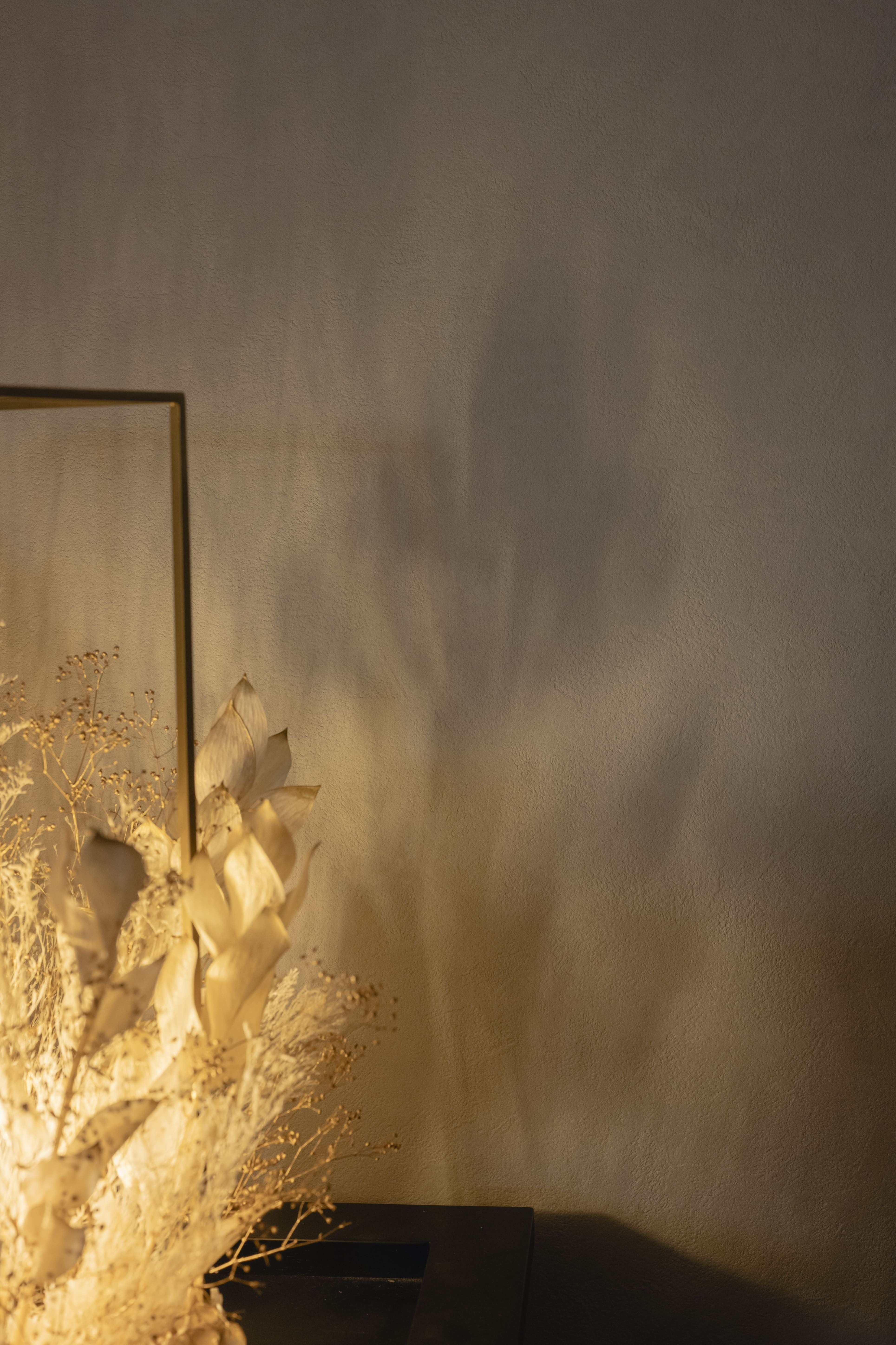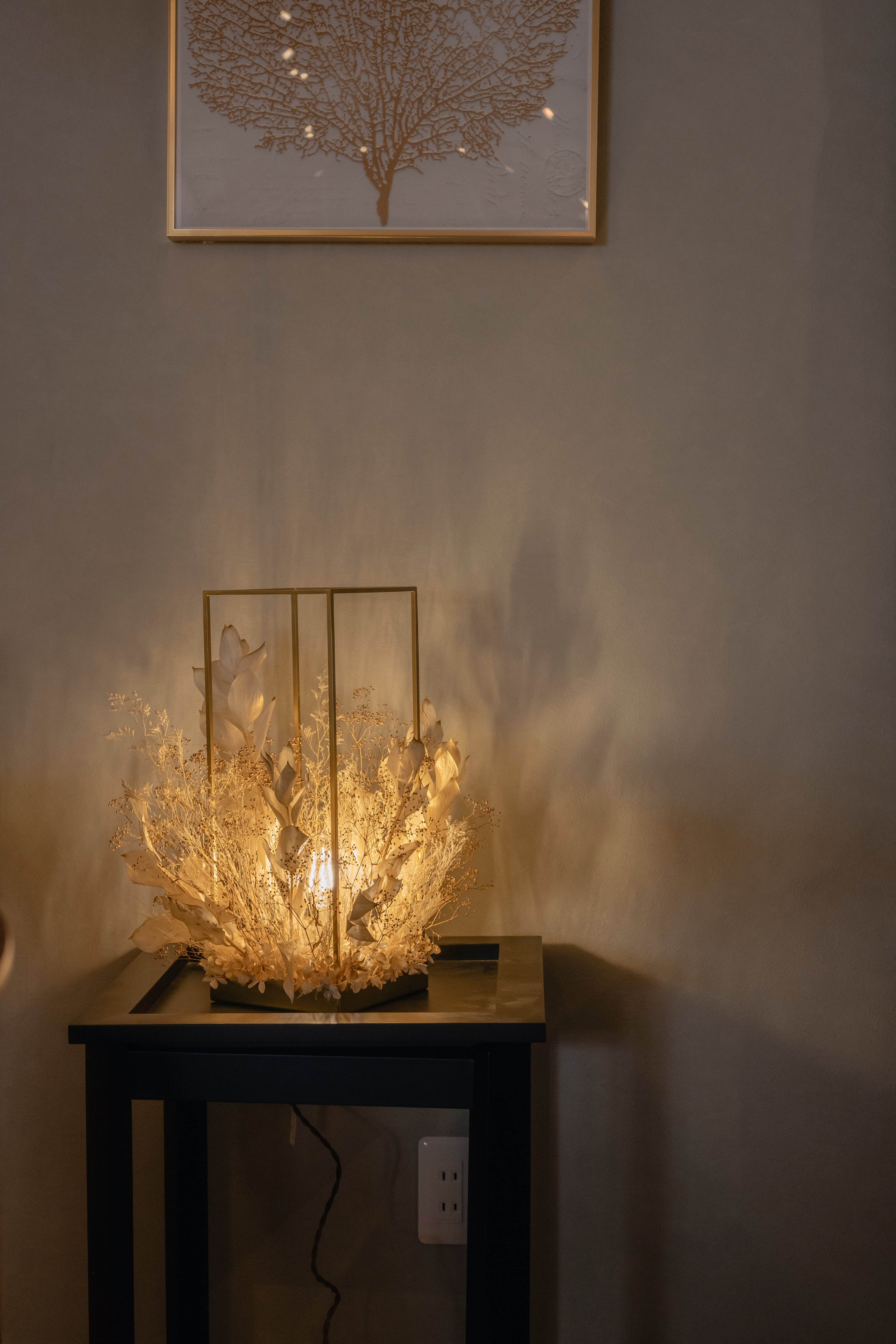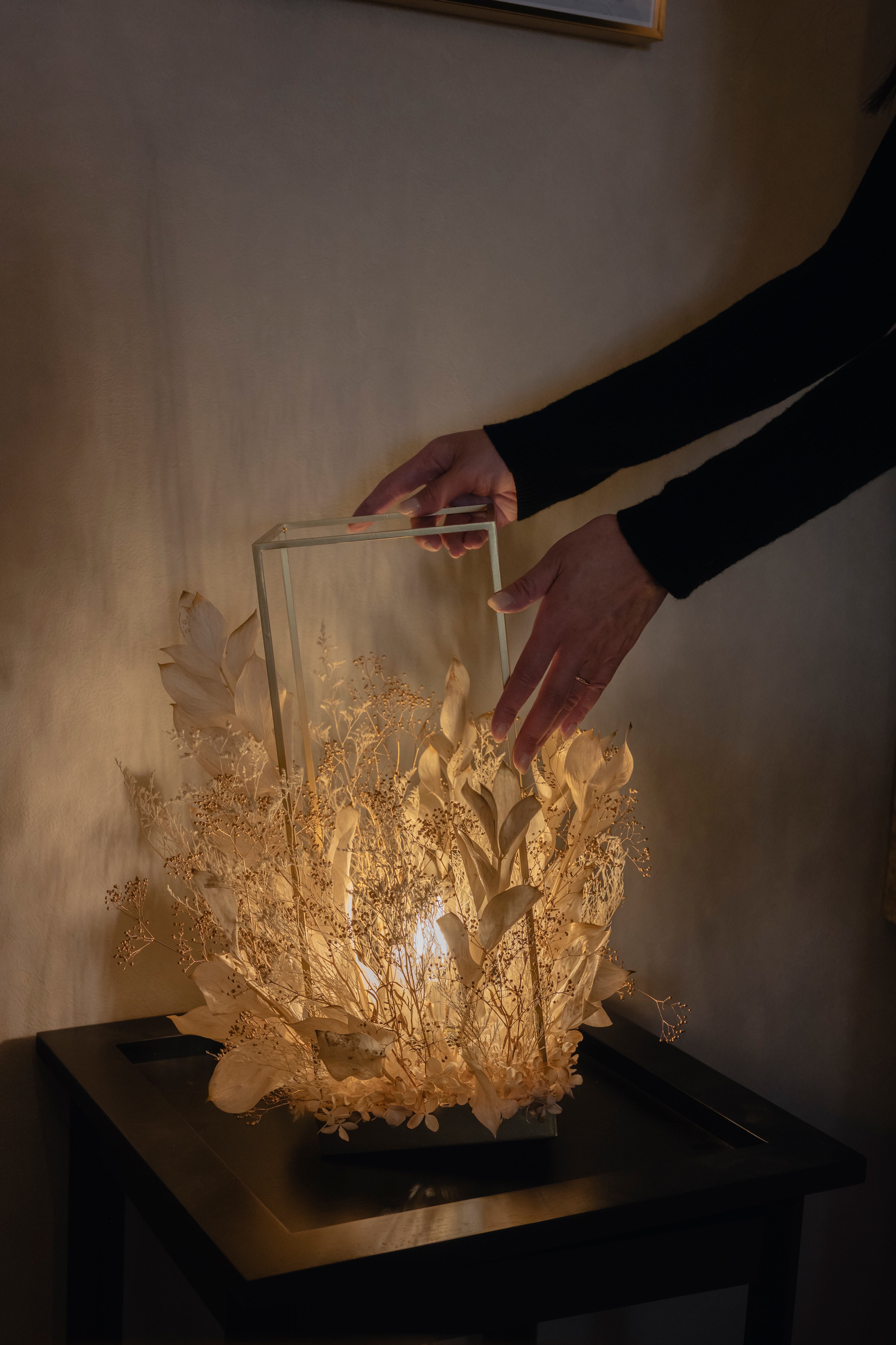 ゴールド調のフレームに、ホワイトゴールドの花材を贅沢にアレンジ。上質な輝きが空間に広がる、高級感あふれるフラワーシャンデリア。花材の隙間からこぼれる光と影が、床や壁に幻想的な表情を描き、癒しの空間が完成します。調光機能付きで、シーンや気分に合わせて明るさの調整も自由自在。日常をワンランク上の時間へと導く、特別な照明です。